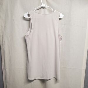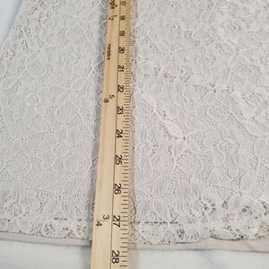 Express cream tank with lace detail. Features elegant embellishments. Ideal for stylish layering. Pre-owned and in good condition. Small line flaw in front of top in mesh and back of tank has little peeling.