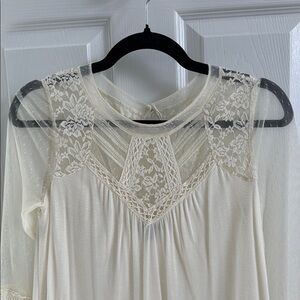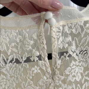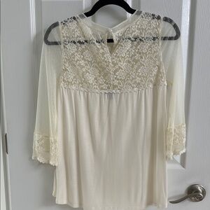 This cream blouse from Express features a relaxed fit with pleated and embellished details, highlighted by a unique bib collar. The soft, lightweight fabric and intricate lace accents add a touch of elegance, making it perfect for various occasions.