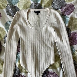 Discover the perfect blend of style and comfort with this cream ribbed bodysuit from Express. Featuring a scooped neckline and long sleeves, this top is a versatile addition to any wardrobe. Its soft, stretchy fabric ensures a flattering fit for any occasion.