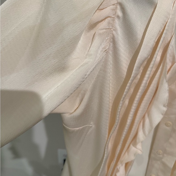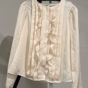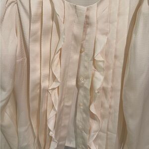 This elegant cream blouse from Express features delicate ruched and ruffled details, adding a touch of sophistication to any outfit. The lightweight fabric drapes beautifully, making it a versatile choice for both casual and formal occasions.