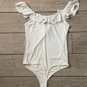 Soft cream bodysuit with a feminine ruffle neckline. Stretch fabric for a sleek fit. Shelf bra with adjustable straps for comfort. Simple, chic piece for layered looks.