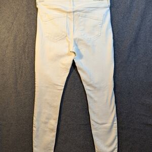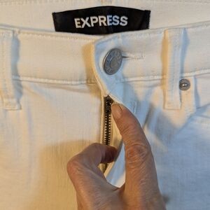 Experience the elegance of Express's cream skinny jeans, designed with a sleek and modern fit. These jeans offer a smooth, clean appearance and a tapered leg, perfect for a sophisticated everyday look.