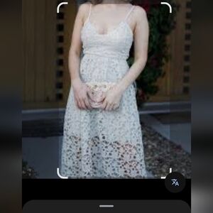 This stunning cream sundress from Express features a tiered midi-length design with a romantic v-neck and spaghetti straps. Perfect for a wedding guest or cocktail event, the dress showcases a beautiful layered look with intricate lace detailing, adding a touch of elegance to any occasion.