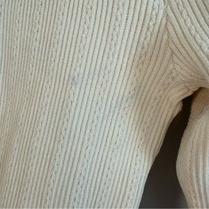 Elegant cream sweater with gold button details. NWT, the sweater has never been worn however, there are two spaces of a light blue faded stain. This sweater has not been washed so quite possibly could come out in the wash. Please let me know if you need any further details.