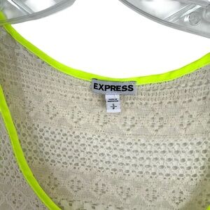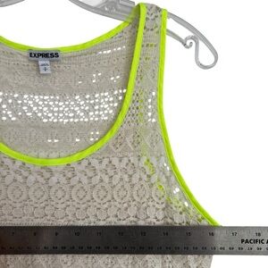 I love the pops of neon green on the armholes of this tank. There’s a cool contrast between the delicate see-through lace and its boxy athletic shape and I think this would pair well with high-waisted sailor shorts or a denim mini skirt.