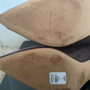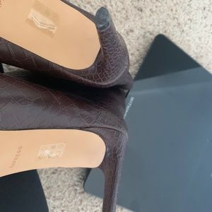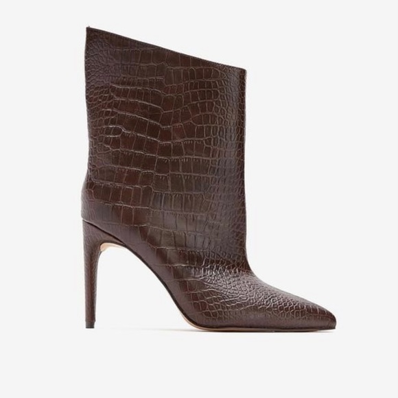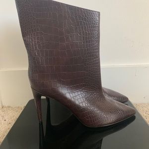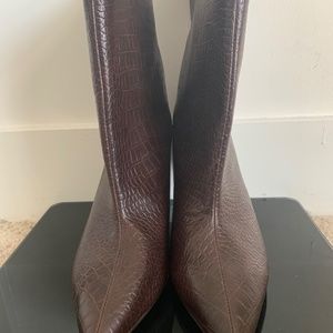 Women’s dark brown croc skin leather booties. Heel height 3”.
