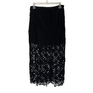 Express black crochet midi skirt with sheer floral lace overlay. New with tags. Boho-inspired style, perfect for layering, festivals, or resort wear.