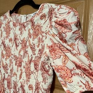 Beautiful blouse Colors are cream/white with pinkish/orange paisley print Soft cotton, smocked ad zipped back, puffy short sleeves EUC - no flaws Approximate measurements: Shoulder to hem: 19" Pit to pit: 14" E2