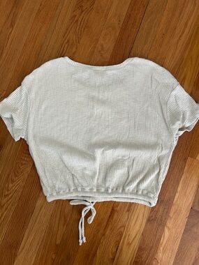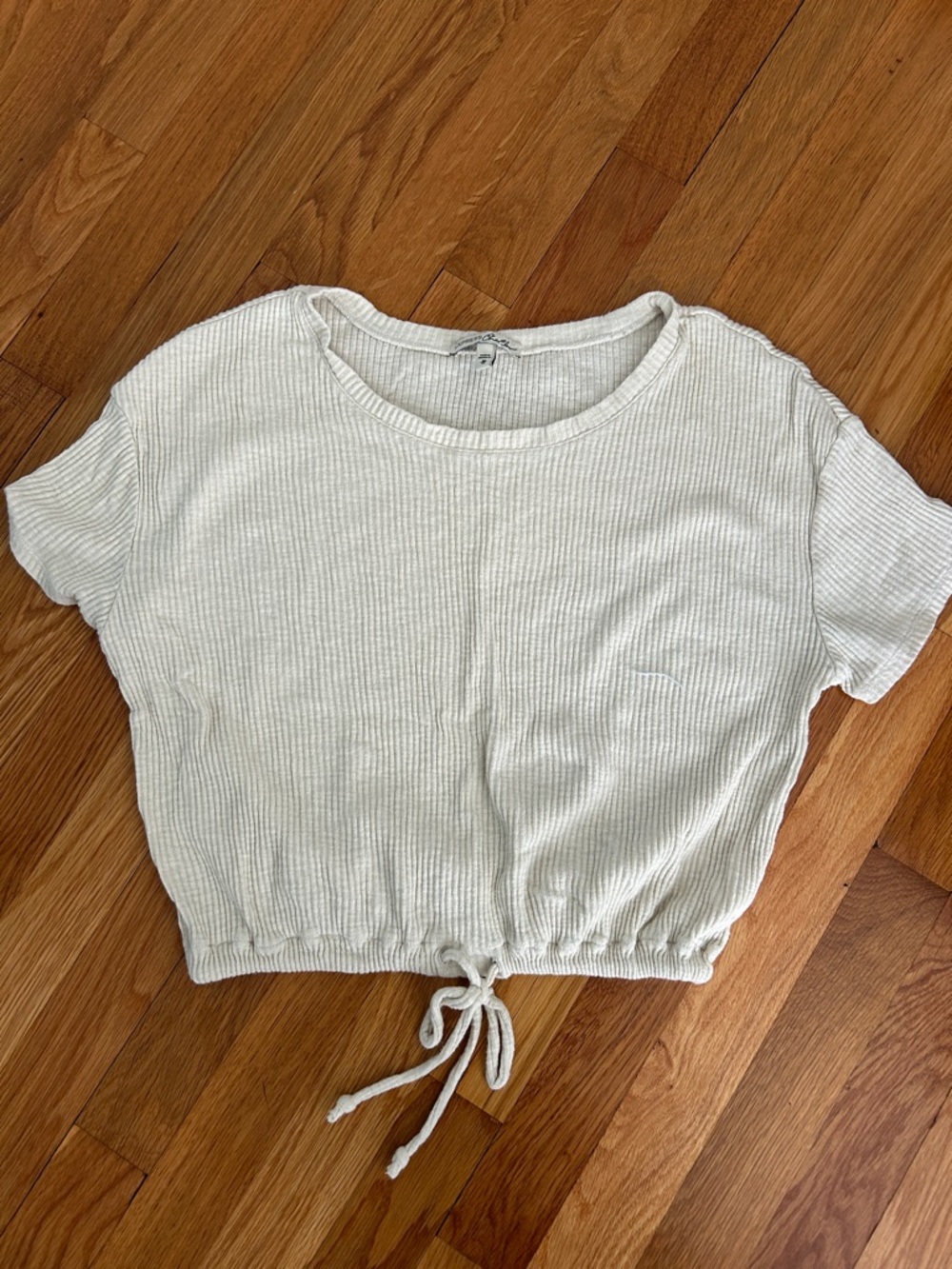 Lightweight ribbed crop top with adjustable drawstring hem for a custom fit. Soft white fabric offers versatile everyday wear. Short sleeves and a relaxed crew neckline for casual comfort.