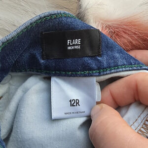 Button, Zip Fly Closure.  5 Pocket Styling.  Flare Silhouette.  High Waist, Rise.