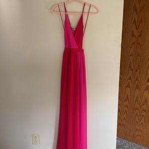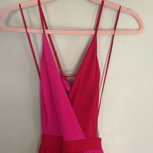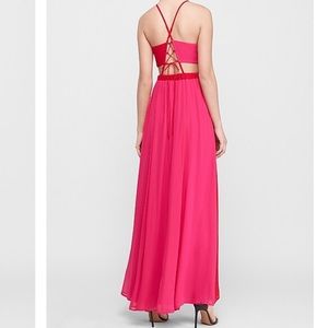 Women’s Express color block cut-out maxi dress. Pink and red color block. V-neck. Faux wrap front. Sleeveless. Adjustable cross-back straps. Lace-up back design. Side cut-outs. Elastic stretch waistband. Lined. Straight hem. Maxi length.
