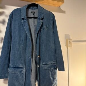 Classic Express denim blazer featuring a tailored longline silhouette with structured seams and subtle waist shaping. Made from mid-weight denim with a soft, broken-in feel. Finished with buttons at the front and cuffs, flap pockets, and a notched lapel for an elevated take on a casual staple. Easy to dress up or down. Perfect layered over tees, tanks, or dresses for a polished everyday look.