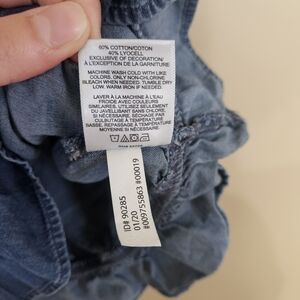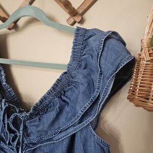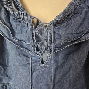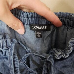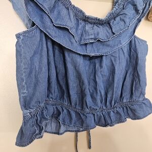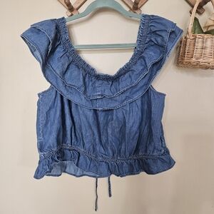 Stylish Express denim blue blouse with ruffle details. Features a tie-front design. Ideal for casual wear. Cropped. Great condition, no flaws. can be worn off the shoulder. XL
