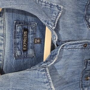 Stylish denim button-up shirt by Express. Features long sleeves and front pockets. Perfect for casual wear.