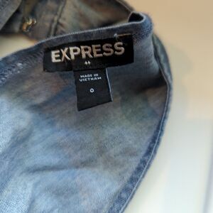 The Express Denim Chambray Jumpsuit in size 0 features a stylish halter neckline and sleeveless design, perfect for summer, fall, or spring occasions like travel, parties, or casual outings.