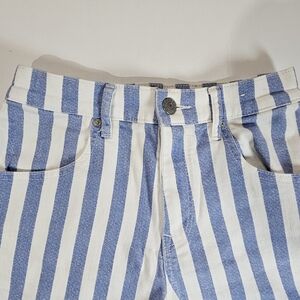 Add a chic vintage twist to your summer wardrobe with these Express Super High Rise Mom Shorts in a size 2. Featuring a flattering shortie cut and eye-catching blue and white vertical stripes, these denim shorts blend retro charm with modern style. The high-rise fit hugs your waist for a defined silhouette, while the relaxed leg offers comfort and versatility. Perfect for casual days, weekend getaways, or summer festivals.