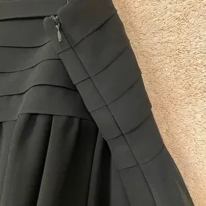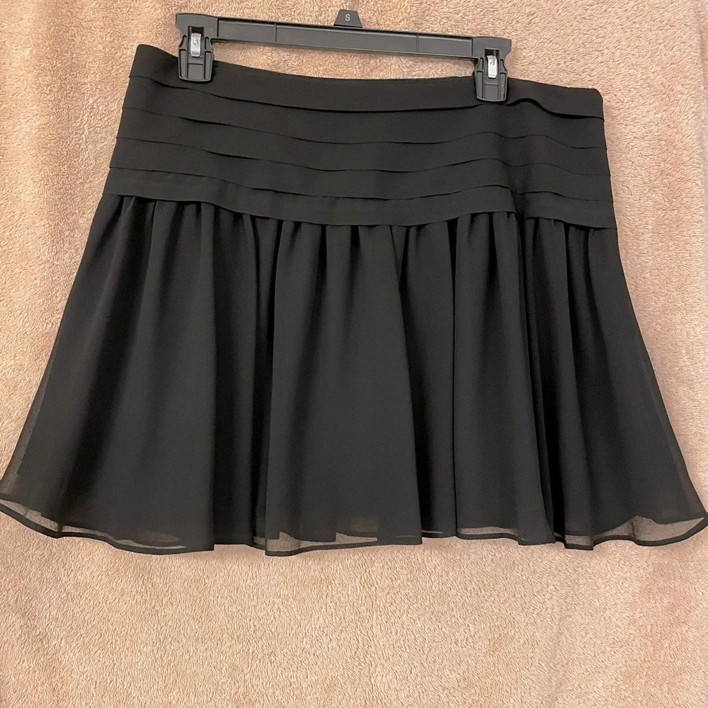 Super cute short black skirt-size 10. Pleats make tummy look flat. Fully lined, side zipper, 16” from top to bottom. Super cute flow! Perfect for a fun night out.