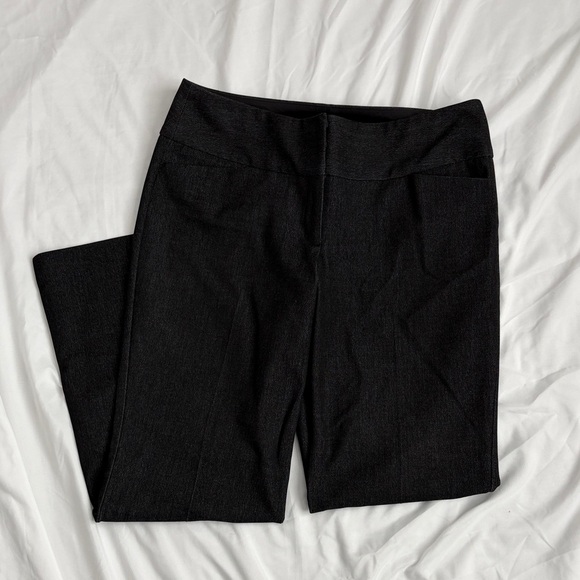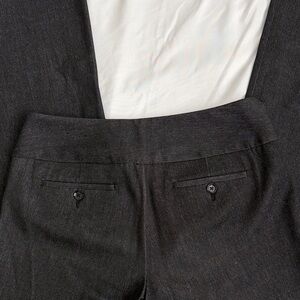 Dark charcoal gray dress pants are perfect for the office! Zip, button, and clip closure. Slat front pockets and buttoned rear pockets. Material is soft and has stretch! Not quite flare leg but not boot cut either. EUC. Non smoking home.