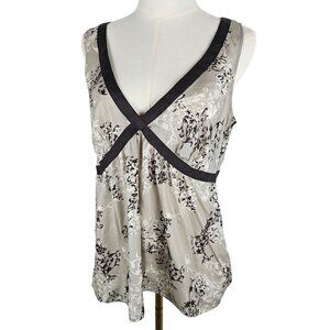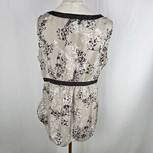 A sophisticated sleeveless top featuring an elegant black and cream floral print on silk fabric. The design incorporates strategic black trim detailing with a crossover V-neckline, creating a flattering silhouette for professional or evening wear.