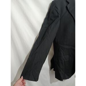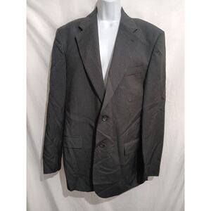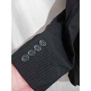 Classic suit jacket from Express design studio in size 42R. Per the tag this is made from 100% fine Italian wool in Turkey. The lining is 100% acetate. It has a subtle pinstripe pattern on a black background. This jacket is not collar style with a two-button front. The sleeves and in four throw button cuffs. Please note the two flap pockets on the front have not been used and as such will need to be cut open. There is one chest pocket on the left hand side of the chest that also needs to be opened as well as two interior pockets and a small hole in the lapel for a boutonniere. I'm sure that has a fancy name I just don't know it The chest measurement is about 42-44 in. The back of this jacket features a double vent. From the shoulder to the hem measures about 31 in.