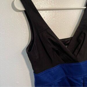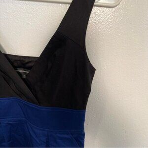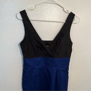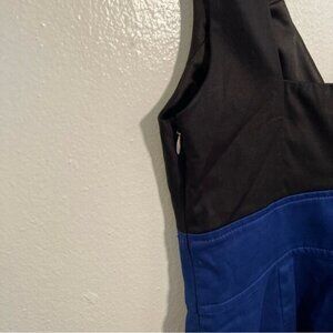Good condition, minor wash wear/ fading. Express design studio. Dress. Sleeveless. Surplice neckline. Blue top and black skirt. Pockets. Zips up side. Slit in back. Size 4. Stretch 99% cotton, 1% spandex. Pit to pit laying flat 15” shoulder to hem 34”. All measurements are approximate and taken lying flat. Smoke free home. No trades, offers welcome.