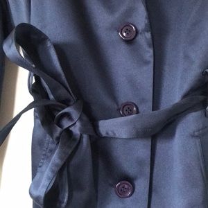 This is a gorgeous rich satiny blue blazer, size medium. Can be paired with jeans or dress pants. Tie waist with 3 button closure. Lightly worn.