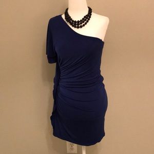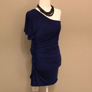 Bright blue, one shoulder dress! Size- extra small -side ruched with ruffle Measurement- shoulder to hem 33”