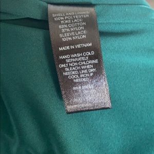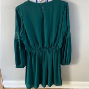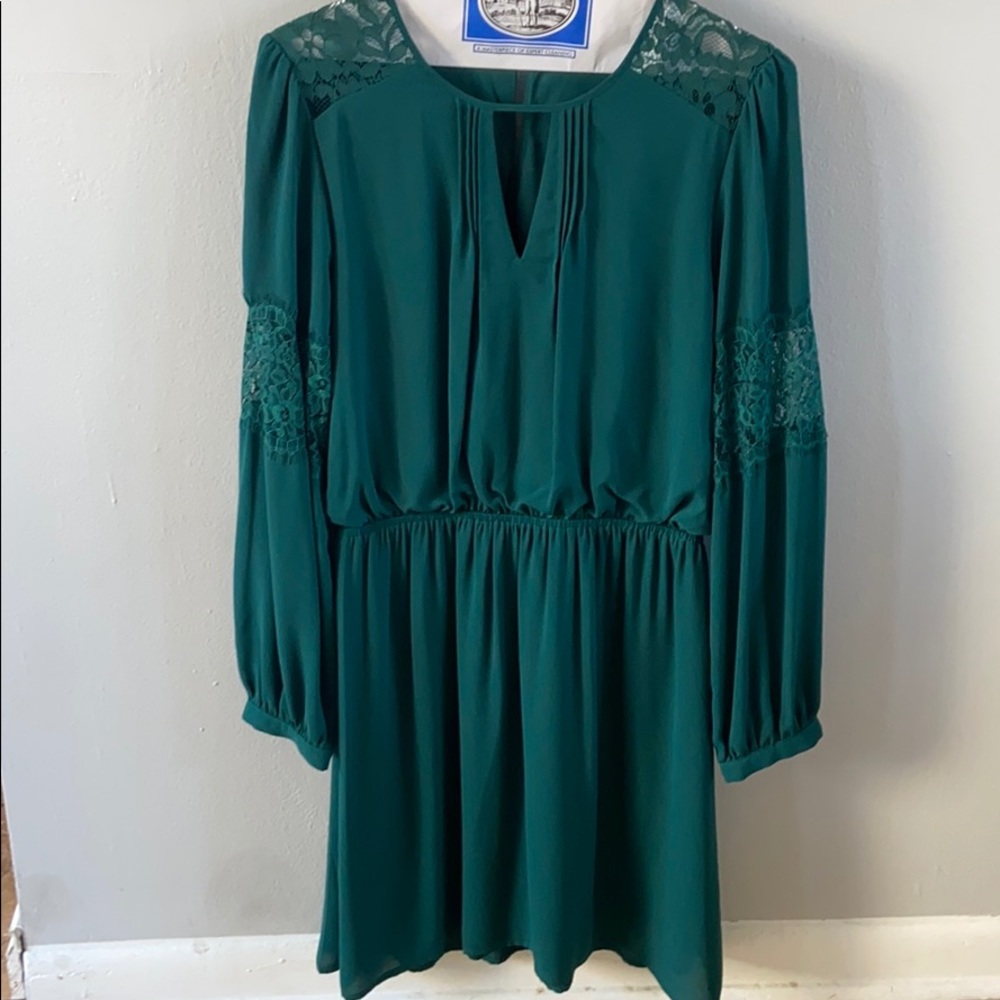 Express dress in green, with lace detailing at shoulders and sleeves, lined skirt. Rouched waist, flowy fit. Keyhole back enclosure with button. In great condition, worn once and dry cleaned.