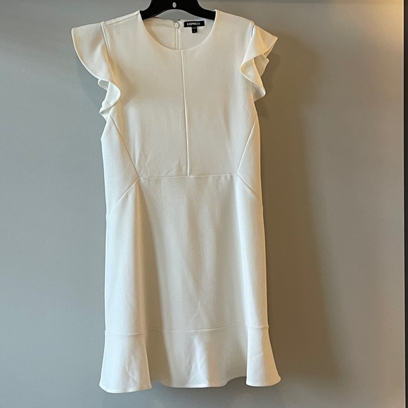 Worn once to my rehearsal dinner for a few hours. Cute white dress with built in slip in the bottom half. Ruffle short sleeves and a ruffle at the bottom with zipper closure in the back. Hit right above my knees length wise (I’m 5’5 for reference)