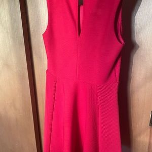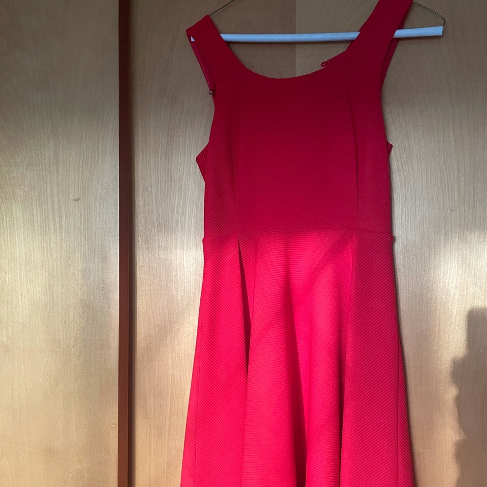 Pretty bright red dress with a fun “lined” texture. Fits snug on the sides and flowy on the bottom. Worn for a wedding guest dress!