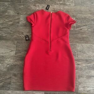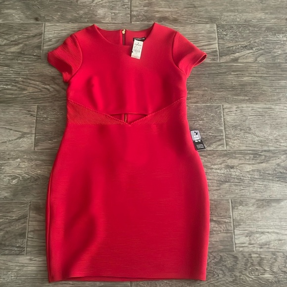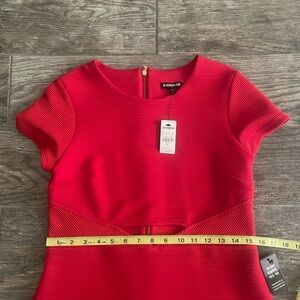 Express dress in red nwt with front detail peekaboo and zipper detail as shown in the pics. The measurements are width 15 inches and length 33 inches .