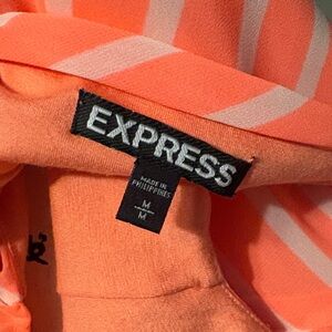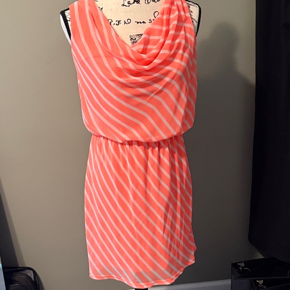 This coral striped dress is perfect for any occasion. Its soft fabric and flattering fit make it a must-have in your wardrobe. Cowl neck. There originally was a belt, but I removed it. Elastic waist.