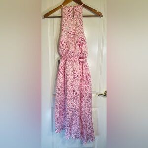 Pink and white dress with playful polka dots. Features a halter neckline and a flowy silhouette. Perfect for casual outings.
