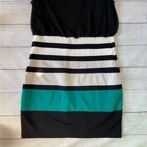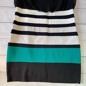 White, beige, and teal stripes. Hem is let down. Colorblock