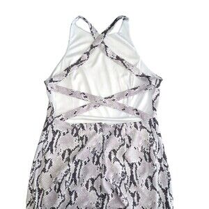 Black and white, snakeskin/reptile pattern, strappy open back, high neck, zipper back, lined, bodycon dress