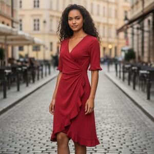 Features: Feminine ruffle hem, flattering wrap front, elegant party/cocktail style