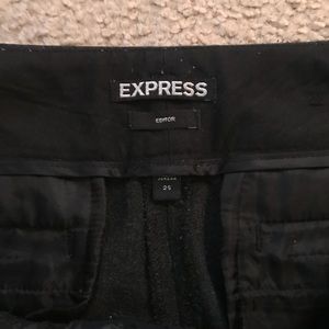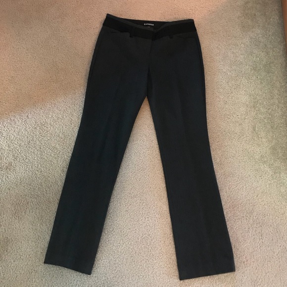 Boot cut, short length, charcoal color (dark gray) with black trim around waist