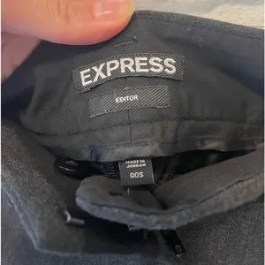 Express Editor slacks. Dark gray and black. Size 00 short. 8 inch rise. Faux back pockets. Good used condition