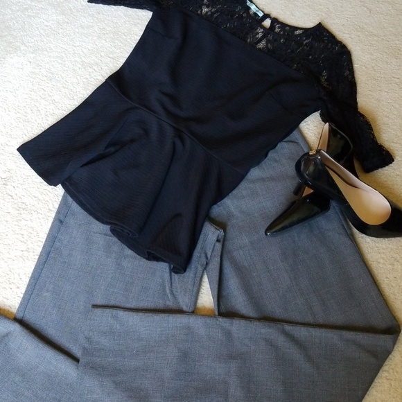 Subtle black and gray plaid print Express Editor trousers. EUC with no tears or stains of any sort. Pants do have a wide leg style with adorable button belt loop details. Looks great with a light weight blouse and heels!