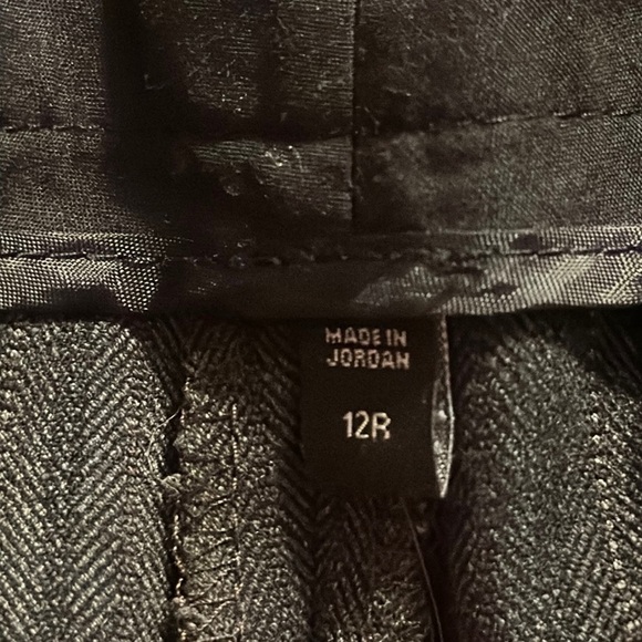 Express Editor Wide Waistband Flare Leg Low Rise Pants 12R NWT. (I would say these are a bit more mid rise.) Gorgeous slacks straight through hip with flare leg and low rise. Style 7112 ID#90012. So many patterns on the slacks see close up for detail. A bit of stripe with small herringbone. Dark gray base. Approximate measurements laying flat 17.5” waist 10” rise 33” inseam.