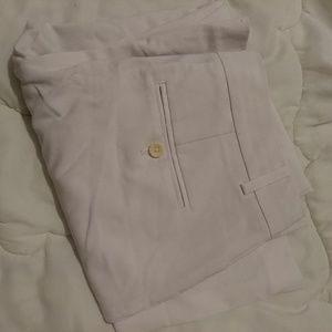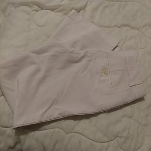 White dress style,pants from express. Editor style. These are a size 2 and regular, but I think they fit short instead. These had no stains or damages but were in storage and I now see a few minor spots on back. Probaly just dust and I assume it will,come out when washed or bleached. I am,pricing low JIC.