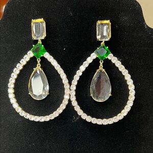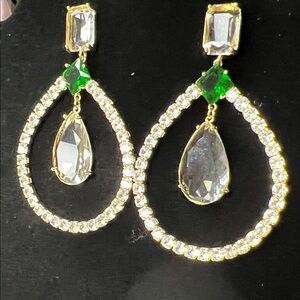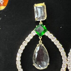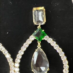 These stunning earrings feature a gold and green design, perfect for adding a touch of elegance to any outfit. The teardrop shape is adorned with sparkling accents, making them a standout accessory.