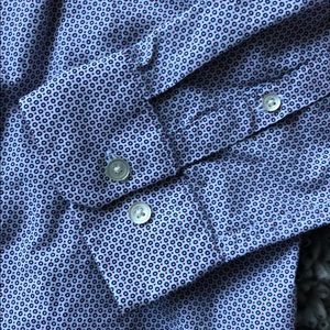 Red and blue dot pattern on this never worn, washed once extra slim men’s button down. Size LG, 16-161/2in