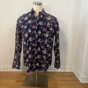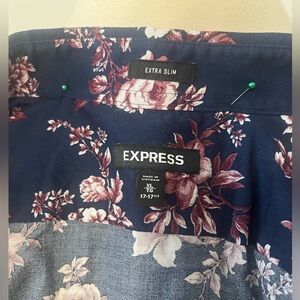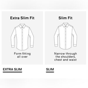Extra Slim Fit means form fitting all over. This statement piece adds a bit of flare to a navy suite or dress it down tucked into jeans. It has button cuffs, collar stays, and a curved hem. This shirt was used once, looks like new. Two buttons are sewn into the tag on the inside for replacements. Fabric is 100% cotton. Machine wash cold with like colors. Gentle cycle. Tumble dry low.