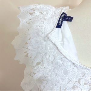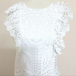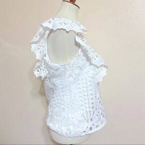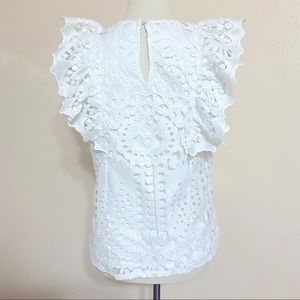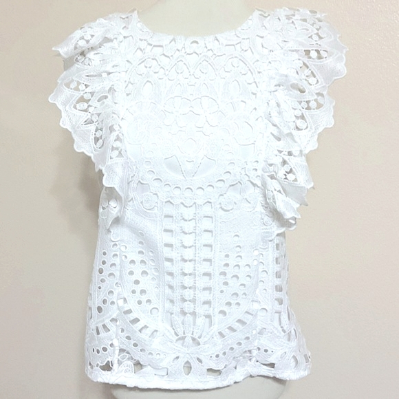 This top by Express is stunning. Features beautiful eyelet, ruffle shoulders, side zip, Lined. Like new Condition wore a couple times.