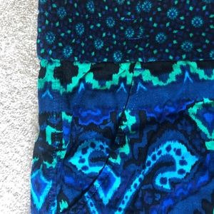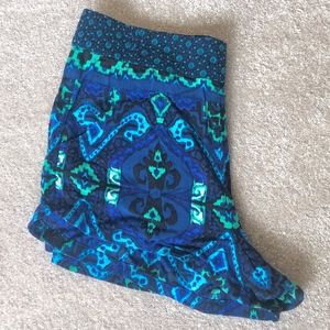 Comfortable! Shorts with a blue/green/black pattern, side pockets, and elastic waistband (but flat in front!).