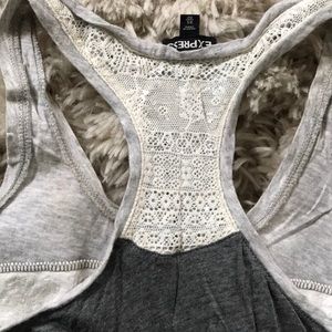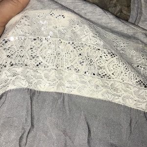 Tri-toned racerback tank top. White lace overlay silver sequins.