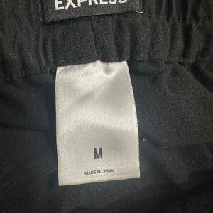 The product is a pair of Express black faux leather joggers for women in size medium. These high-rise pants feature a pull-on closure, stretch fabric, and pockets for a stylish and comfortable fit. The tapered leg style and classic fit make them versatile for all seasons, while the solid black color and sleek design give them a modern and trendy look perfect for casual occasions. Made of faux leather and a blend of polyester and spandex lining, these joggers are machine washable for easy care and are sure to become a staple in any athleisure wardrobe.Questions? Leave a comment below!