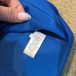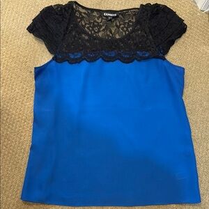 This elegant blouse from Express showcases a striking blue body paired with delicate black lace detailing on the chest and shoulders. The fitted design and scalloped edges enhance its sophisticated appeal, making it ideal for both casual and formal occasions.