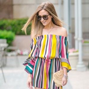 The Express Flare Sleeves Shorts Romper in size Medium is a stylish and vibrant one-piece outfit perfect for various occasions such as travel, parties, or casual outings. Featuring a flattering off-the-shoulder neckline and flared sleeves, this romper is made from comfortable rayon fabric in multicolored stripes. The pull-on closure and regular fit make it easy to wear and versatile for different seasons like summer, fall, and spring. Machine washable and with a 2.5-inch inseam, this romper offers both style and convenience for the modern woman.